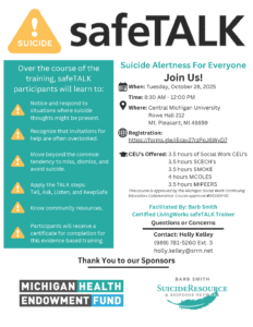 CMU Psychology Students safeTALK CLOSED TO THE PUBLIC + Add to Google Calendar + iCal / Outlook export Date Oct 28 2025 Expired! Time 8:30 am - 12:00 pm Location CMU Psycology Rowe Hall Category safeTALK SRRN Training and Events Organizer Barb Smith Suicide Resource & Response Network Phone (989) 781-5260 Email holly.kelley@srrn.net Website http://www.srrn.net Share this event