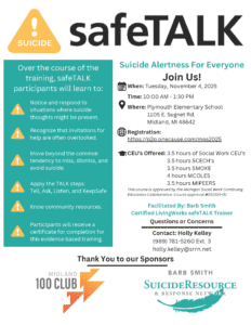 Midland Public Schools Paraprofessionals safeTALK CLOSED TO THE PUBLIC + Add to Google Calendar + iCal / Outlook export Date Nov 04 2025 Expired! Time 10:00 am - 1:30 pm Location Plymouth Elementary School 1105 E. Sugnet Rd., Midland, MI 48642 Category safeTALK SRRN Training and Events Organizer Barb Smith Suicide Resource & Response Network Phone (989) 781-5260 Email holly.kelley@srrn.net Website http://www.srrn.net Share this event